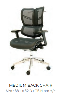 Fully functioned Korean mesh seat and Back, Adjustable 4D chrome PU arms, Seat slides, back slides up and down with a chrome metal support, Aluminum swivel spider base and jacket holder Adjustable headrest.