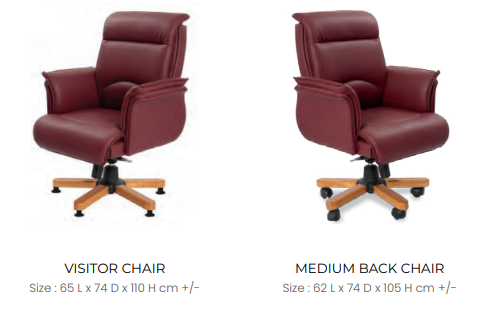 Fully Upholstered wing arms, Knee tilting mechanism and wooden base with castors.